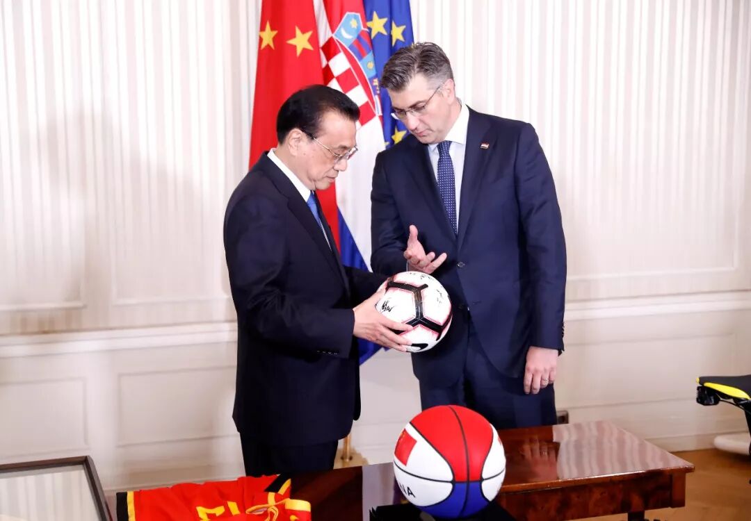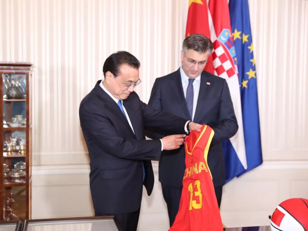 中国篮球运动员姚明是全球知名的篮球明星,克罗地亚“红白格子军团”则是去年俄罗斯世界杯的亚军获得者。当地时间4月10日上午,李克强总理将一件姚明签名的13号球衣,赠送给篮球爱好者、克罗地亚总理普连科维奇。普连科维奇总理则回赠李克强一个克罗地亚国家足球队集体签名的足球。除此之外,李克强所赠的礼品还有一个印着中克两国国名和国旗的特制篮球。普连科维奇还赠送中国总理一辆克罗地亚企业生产的运动自行车。两国总理当天会谈后,共同见证了双方在体育等领域双边合作文件的签署。中克政府发布的联合声明表示,双方愿加强体育领域合作,支持两国政府体育部门、奥委会和体育单项协会加强交流。