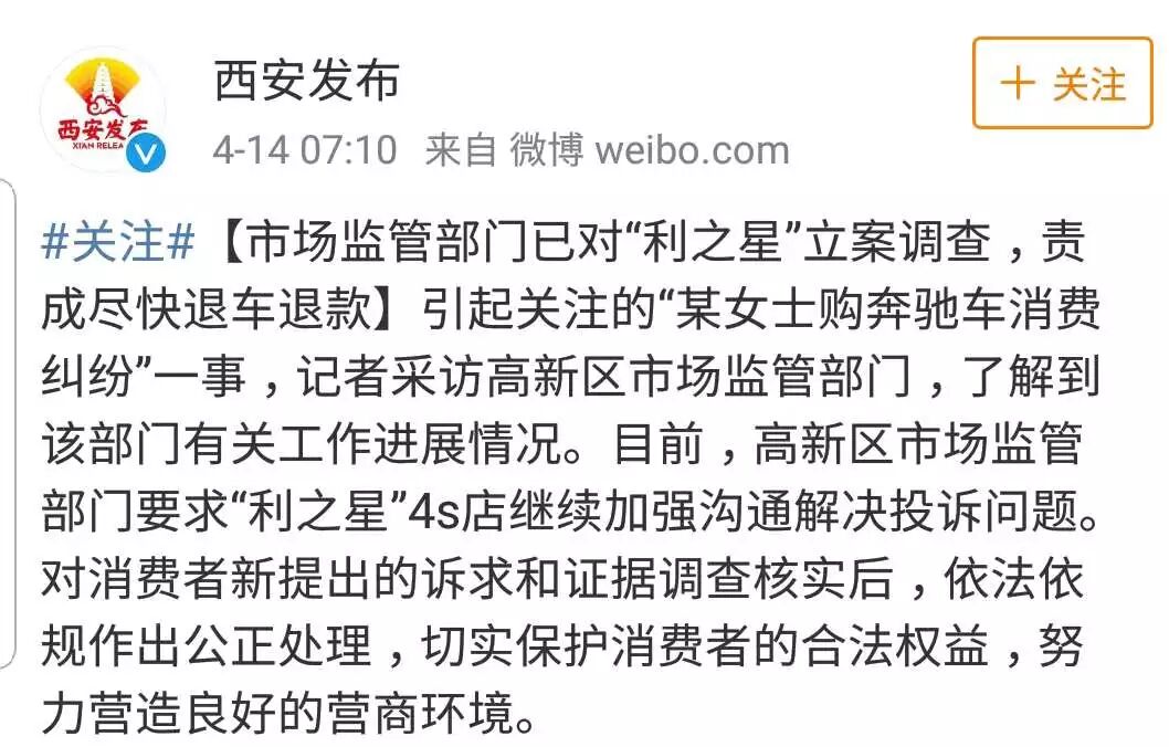 14日早上,西安市互联网信息办公室在官方微博发布消息称,涉事4S店涉嫌质量问题已被立案调查,市场监管部门责成尽快退车退款。