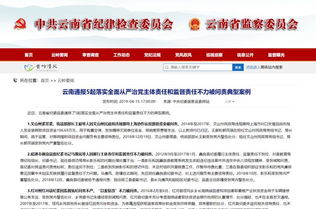 近日,云南省纪委省监委通报了5起落实全面从严治党主体责任和监督责任不力的典型案例。