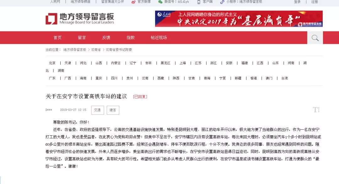 网友给云南省委书记陈豪的留言表示,随着安宁市经济社会的快速发展,外来人员逐步增多,乘坐高铁出行的需求也不断增长,在安宁市设置高铁站显得日益迫切。 该网友表示,云南的交通基础设施快速发展,特别是昆明到大理、丽江的动车开行以来,极大方便了当地群众的出行,作为一名在安宁打工的大理人,受益良多,但美中不足在于,安宁市辖区内没有设置高铁站,每次来回大理时,必须要坐1个多小时的汽车到昆明站或到60多公里外的禄丰南站坐车,不仅要承担高速公路过路费,而且经常堵车,十分不方便。