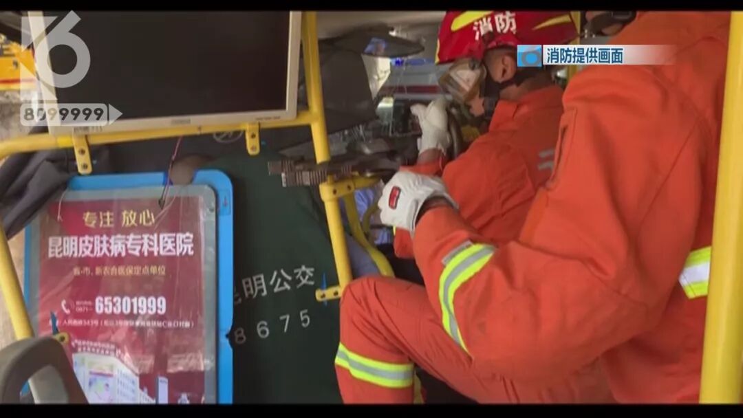 由于公交车车头严重变形,驾驶员双腿被卡在仪表台下方不能动弹,随后赶到的消防人员立即展开救援。
