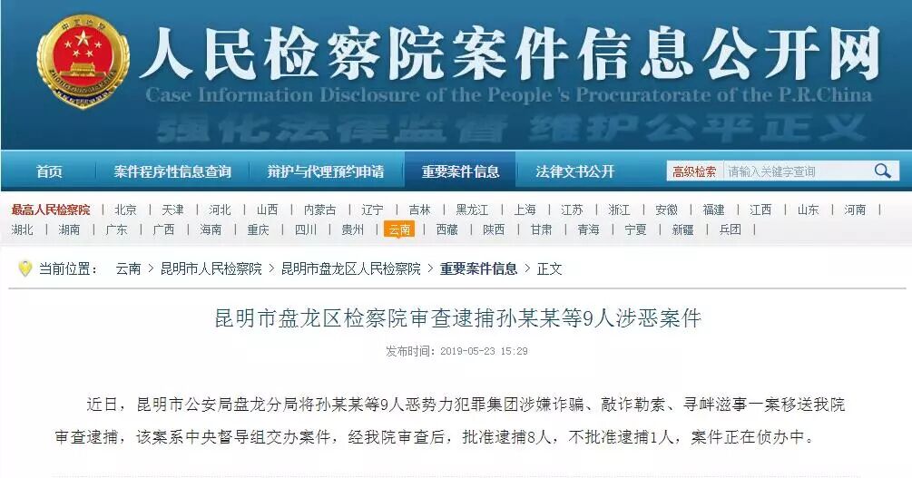 5月27日,记者从人民检察院案件信息公开网获悉,近日,昆明市公安局盘龙分局将孙某某等9人恶势力犯罪集团涉嫌诈骗、敲诈勒索、寻衅滋事一案移送昆明市盘龙区检察院审查逮捕,该案系中央督导组交办案件,经该院审查后,批准逮捕8人,不批准逮捕1人,案件正在侦办中。