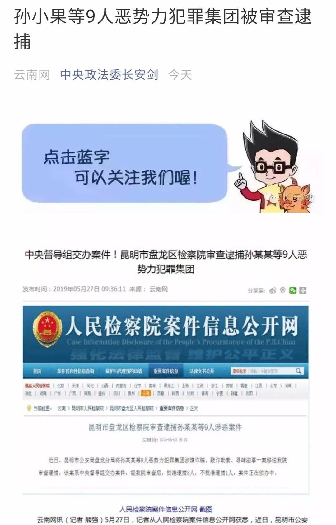 中央政法委的官方微信公众号也发布了此条信息,直接点名“孙某某”为“孙小果”。盘龙检察院中午回复媒体,孙某某非孙小果。