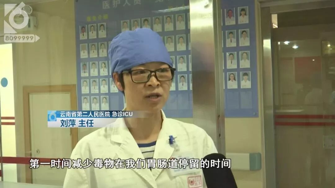 云南省第二人民医院急诊ICU主任刘萍介绍,“最直接办法就是刺激咽喉部,吐,刺激咽喉部吐出来,然后大量的喝水呕吐,减少毒物在我们胃肠道停留的时间。”