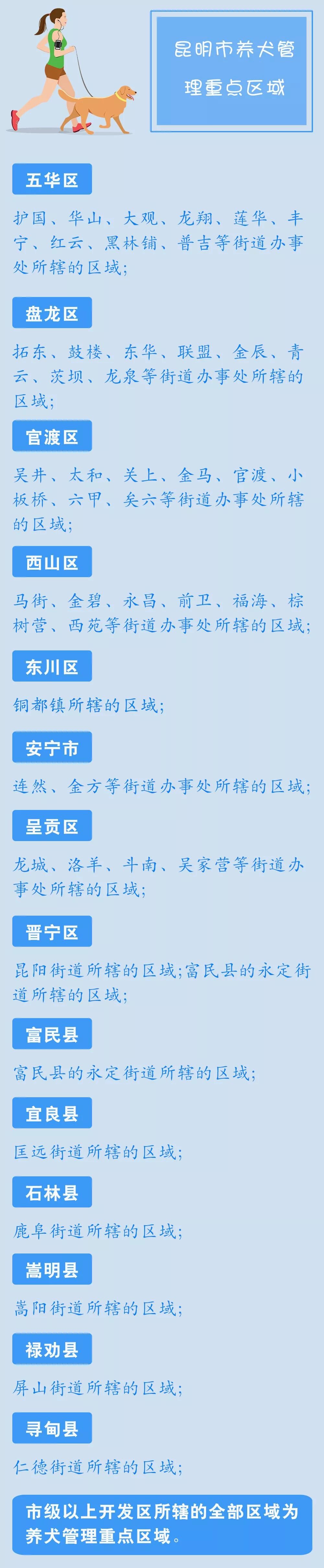 第一步 集中宣传阶段 时间:2019年7月 工作任务: 1.开展集中宣传。昆明市养犬管理工作协调领导小组办公室、市文明办牵头,组织开展“昆明市文明养犬集中宣传活动启动仪式”,围绕“依法文明养犬,共建文明城市”主题,通过宣传法律法规,发放宣传手册、文明养犬倡议书、《昆明市关于进一步加强和改进养犬管理的通告》,发放犬绳,推广“昆明市养犬服务平台”应用等多种形式,向社会进一步宣传我市养犬管理工作的相关政策规定,让广大养犬爱好者充分认识文明养犬的重要性,增强广大养犬爱好者依法养犬、科学养犬、文明养犬的自觉性。 2.深化社区宣传。市文明养犬集中宣传活动启动后,各县(市)区、各开发(度假)区要紧紧围绕活动主题,结合自身实际,突出辖区特色,采取灵活多样、内容丰富的形式,认真组织开展文明养犬集中宣传活动。各街道办事处、社区要以小区、楼院为重点,持续组织开展形式多样的文明养犬宣传教育活动,积极推进社区居民文明行为养成,共同构建文明和谐的社会环境。 第二步 严格管理阶段 时间:2019年8月-10月 工作任务: 1.强化行业管理。各级公安、城市管理、农业农村、市场监管、卫生健康、住建等职能部门,按照《昆明市养犬管理条例》规定,结合创建全国文明城市工作要求,认真履行行业管理职责,切实加大养犬管理工作力度。 2.加强联动执法。 第三步 长效保持阶段 时间:2019年11月起 工作任务: 在持续开展宣传教育引导、着力规范纠正的基础上,按照《昆明市养犬管理条例》和《昆明市关于进一步加强和改进养犬管理的通告》,进一步完善相关工作机制,逐步建立养犬管理长效机制,推进养犬管理工作常态化,使养犬管理工作逐步走上规范化轨道,实现依法、科学、有序、长效管理。 今年初,市公安局、市农业农村局、市市场监管局、市城市管理局联合下发《关于进一步加强和改进养犬管理的通告》,为文明养犬立下“硬规矩”。 在养犬管理重点区域内,禁止饲养烈性犬和设置犬只养殖场所。对违规饲养烈性犬只的,由公安机关责令限期改正,对个人处200元以上500元以下罚款,对单位处1000元以上3000元以下罚款。 在重点区域内设置养殖场所的,由农业(畜牧)、市场监管部门予以取缔,没收违法所得,并处5000元以上10000元以下罚款。 相关部门执法期间,对开办动物养殖场所的,按照《动物防疫法》的相应条款和处罚依据执行。 一般管理区饲养的犬只不得带入重点区域。违反规定的,由公安机关责令改正,处200元罚款。 在重点区域内,禁止携犬进入机关、团体等各类公共场所。违反规定的,由公安机关给予警告、责令改正。 在重点区域内,养犬人携犬出户时必须对犬束犬链,并由具有完全民事行为能力的人牵引,约束好犬只。违反规定的,由公安机关给予警告,拒不改正的,处200元以上500元以下罚款。 携犬外出,要携带清洁工具,及时清洁犬只排泄物,违反规定的,由城市管理行政部门给予警告,拒不改正的,处50元以上200元以下罚款。 来源:昆明发布、昆报头条 责任主编:安远洪