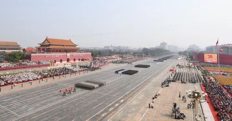 雄壮的军乐声中,习近平乘车沿着宽阔的长安街,依次检阅15个徒步方队、32个装备方队。近15000名受阅官兵整齐列阵、英姿勃发,580台受阅装备在阳光下熠熠生辉。这是中国特色社会主义进入新时代的首次国庆阅兵,也是共和国武装力量改革重塑后的首次整体亮相。