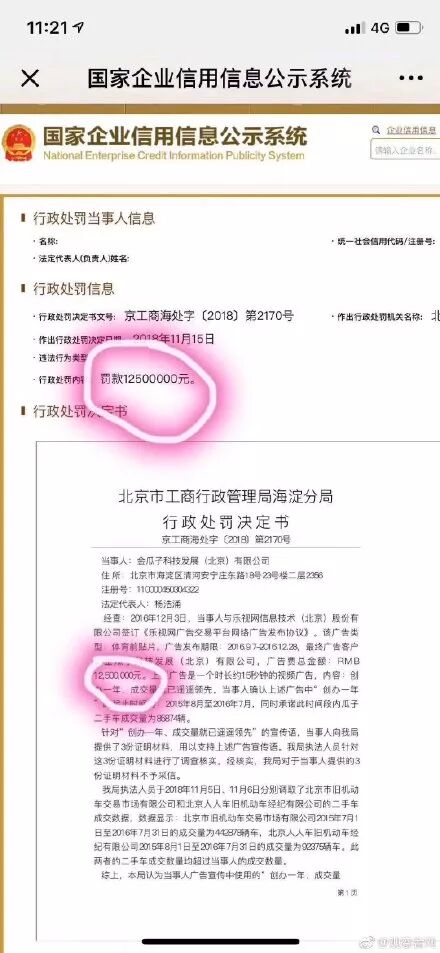 对于1250万的罚款,李亚认为这是一个正常的金额,在行政执法部门认为其涉嫌虚假广告时,会参照广告费来判处罚金。海淀分局的行政处罚决定书显示,瓜子二手车在2016年9月和乐视网签订了一份金额1250万网络广告发布协议,内容就是“创办一年,成交量就已遥遥领先”。