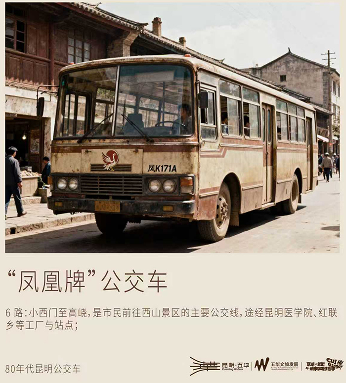 这三辆“移动的城市记忆”,每一辆都藏着老昆明的烟火气。60年代的“万国牌”2路车,曾穿梭于忠爱坊与云纺之间,载着工人师傅们开启工业时代的清晨;70年代的“春城牌”5路车,沿东风路这条五华区“主动脉”贯穿东西,见证了街头梧桐树的四季轮回;80年代的“凤凰牌”6路车,更是无数老昆明人的“出游伙伴”,载着欢声笑语驶向西山脚下。如今它们“重返”南屏街,变身为讲述五华故事的“移动博物馆”,一开门就引得市民争相打卡。
