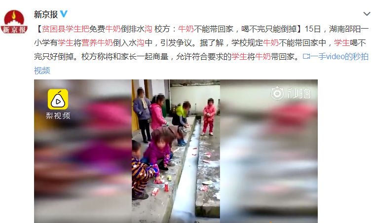 近期,一段“贫困县学生把免费牛奶倒入水沟”的视频引起广泛关注。视频中,几名小学生模样的孩子蹲站在水沟边挤压品牌为“湘蜜”的盒装牛奶,水沟呈现一片乳白色。