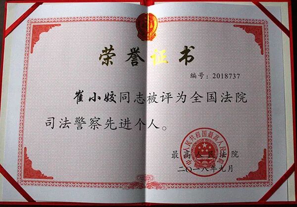 她,就是2018年被最高人民法院评为“全国法院司法警察先进个人”的咸阳市中级人民法院法警支队警政警务科司法警察崔小姣。