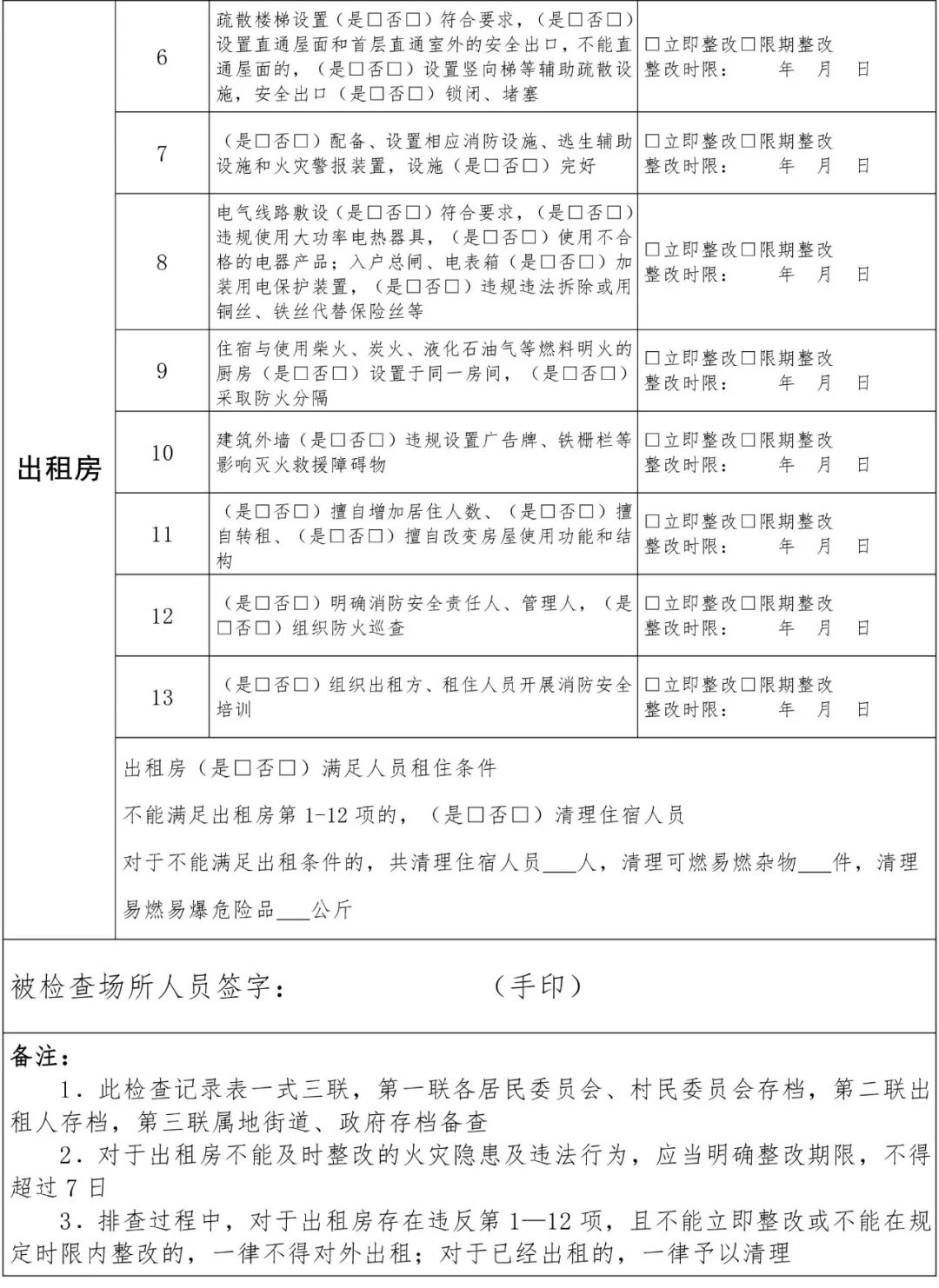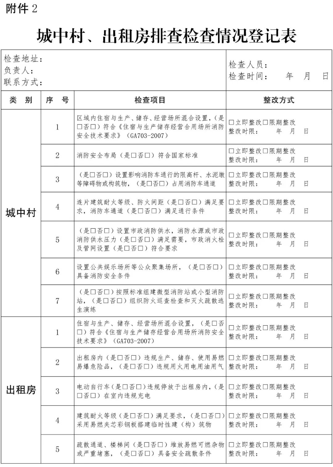 2.城中村、出租房排查检查情况登记表