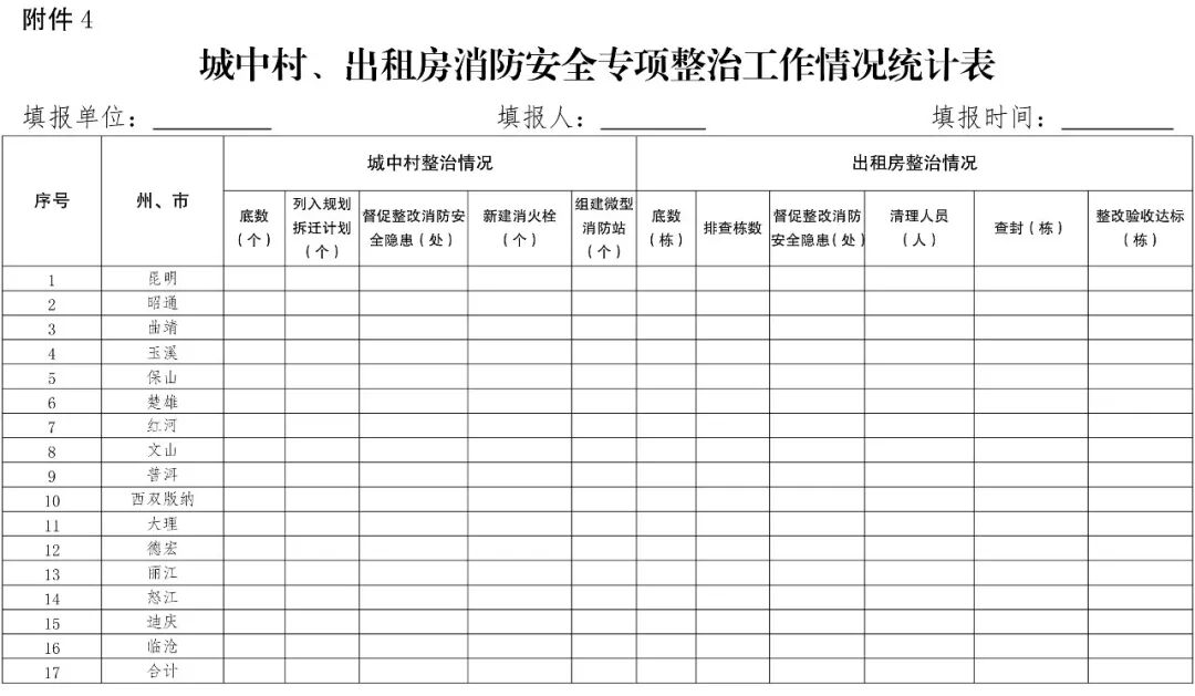 (五)加强信息反馈。各地要建立定期报告制度。各州、市人民政府须于2019年1月5日前向省专项整治工作领导小组办公室上报《城中村、出租房消防安全专项整治工作专班统计表》(见附件3),每月25日前上报本月工作情况和《城中村、出租房消防安全专项整治工作情况统计表》(见附件4);专项整治工作结束后10日内上报工作总结。各地要积极报送有关信息工作简报,及时反映专项整治工作中的典型做法。省专项整治工作领导小组办公室联系人及电话:李京泽,0871-64569516,0871-64569518(传真)。