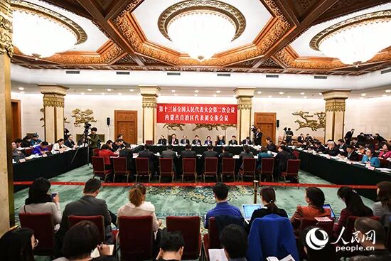 第十三届全国人民代表大会第二次会议内蒙古自治区代表团全体会议期间,代表认真听取会议情况 人民网 陈立庚摄