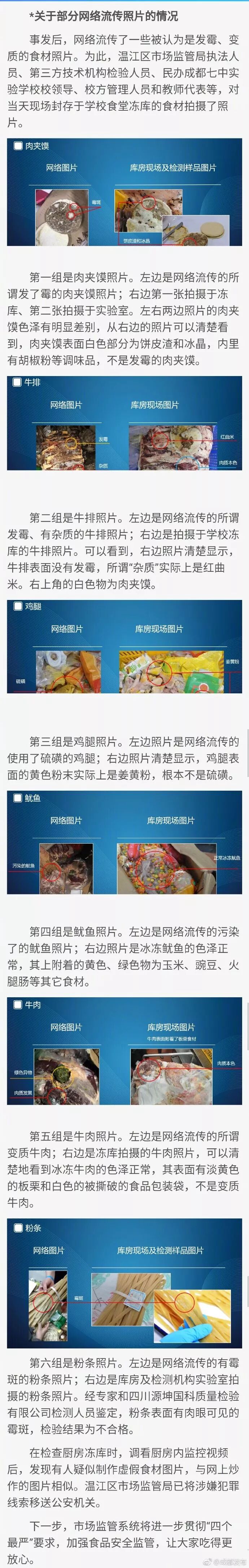 另外,3月13日(同日),警方还发现,网上流传内容为“成都七中实验学校食堂给学生吃的是腐食,含有大量黄曲霉毒素,导致学生长期腹泻,现家长维权,已有家长跳楼身亡”的不实信息,后被其他网民大量转发扩散,造成恶劣的社会影响。