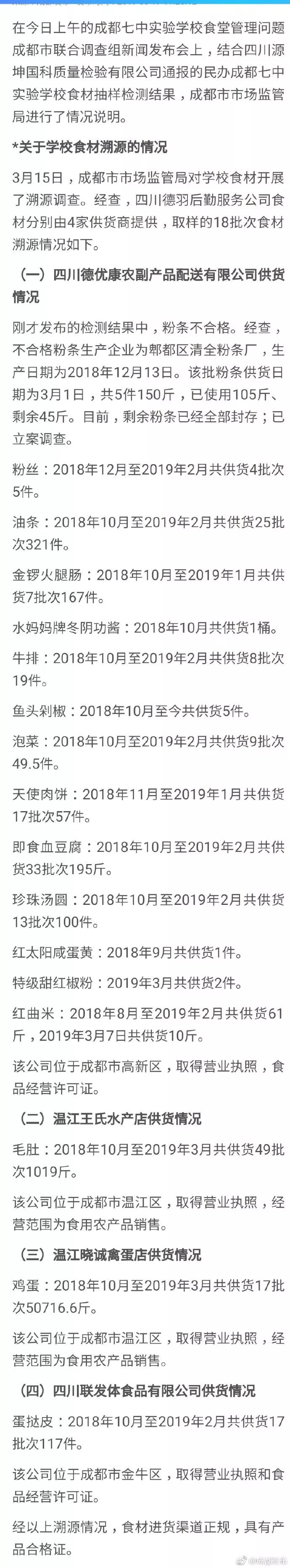 成都市市场监管局:溯源情况显示食材进货渠道正规、具有产品合格证